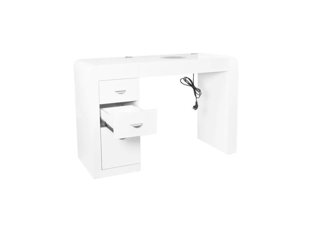 Három tágas fiókja megkönnyíti a nélkülözhetetlen kozmetikumok és eszközök rendszerezését és karbantartását. Az íróasztal praktikus porszívóval van felszerelve , amely hatékonyan csökkenti a káros port, biztosítva a tiszta és friss levegőt a munkahelyen . Ugyanakkor a beépített kialakításának köszönhetően nem foglal el értékes munkaterületet. A speciálisan kialakított kábelrendező megkönnyíti a nélkülözhetetlen szalonfelszerelések, például a marógépek, kezelőlámpák és körömlakkok rendszerezését, lehetővé téve a kábelek elrejtését.