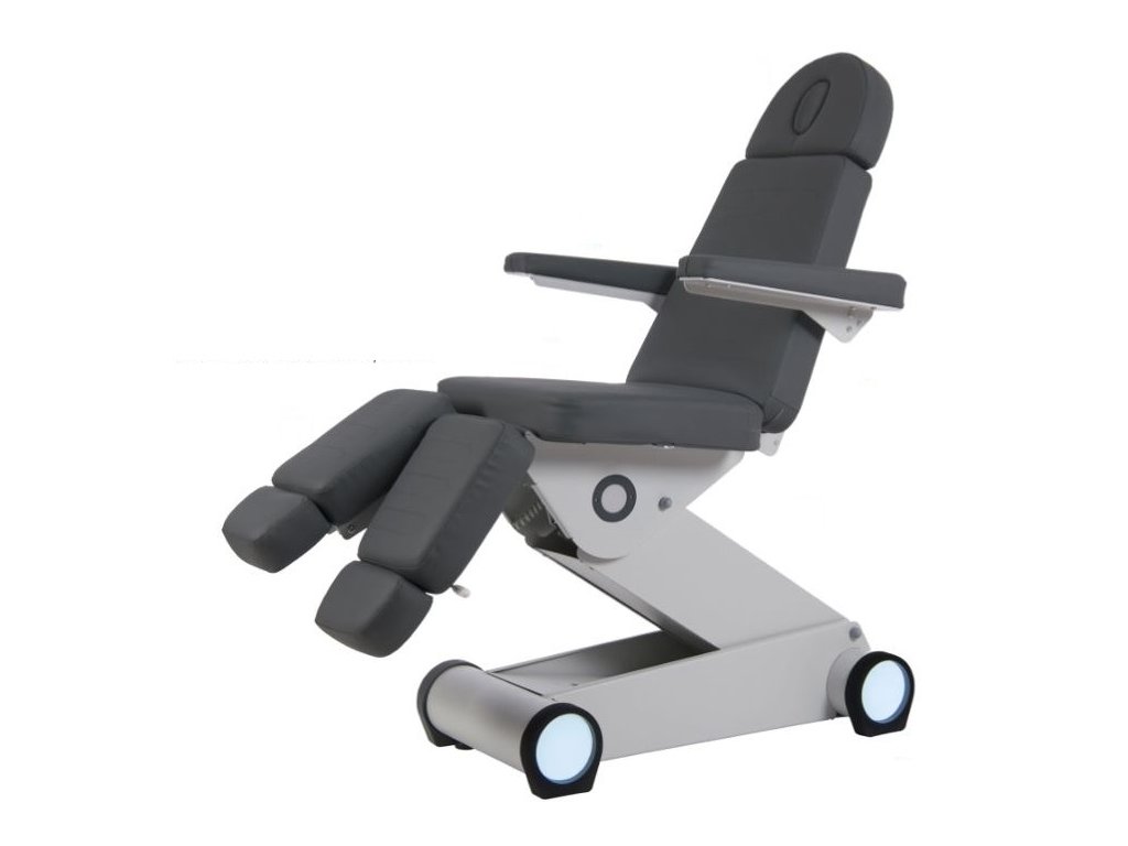 Luxus podológiai szék, amely innovatív kialakításával tűnik ki. 3 motorral van felszerelve, amelyek a háttámla és az üléspárna magasságát és dőlését szabályozzák. Összecsukható és levehető karfák és fejtámla. Állítható magasságú lábtartók gázemelővel. Rendkívül stabil acélszerkezet, a talpba épített fehér LED-lámpával. Kiváló minőségű fehér PU kárpitozás.