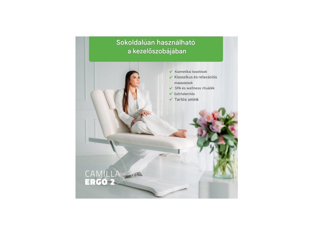 Tökéletes szépségszalonok, spa központok, masszázsstúdiók és wellness létesítmények számára, ahol relaxációs, bőrápolási és szőrtelenítő kezeléseket kínálnak. Beépített fűtési funkciójával és elektromos beállításával a Camilla ERGO 2 optimális kényelmet biztosít mind a kliens, mind a terapeuta számára a teljes munkanap során.