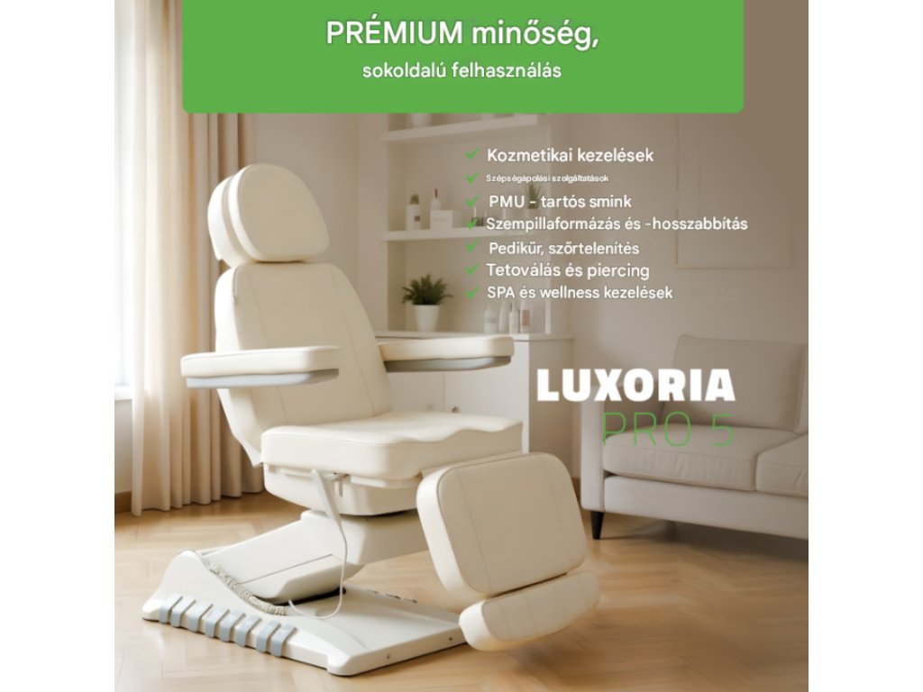 A Luxoria PRO 5 egy modern, teljesen elektromos vezérlésű szépségfotel, amelyet igényes szépségklinikák, esztétikai orvosi rendelők és SPA központok számára terveztek. Fejlett beállítási funkciók, kiváló felhasználói kényelem és elegáns kialakítás teszi a Luxoria PRO 5-öt tökéletes választássá a funkcionalitást és a presztízst kereső szakemberek számára.