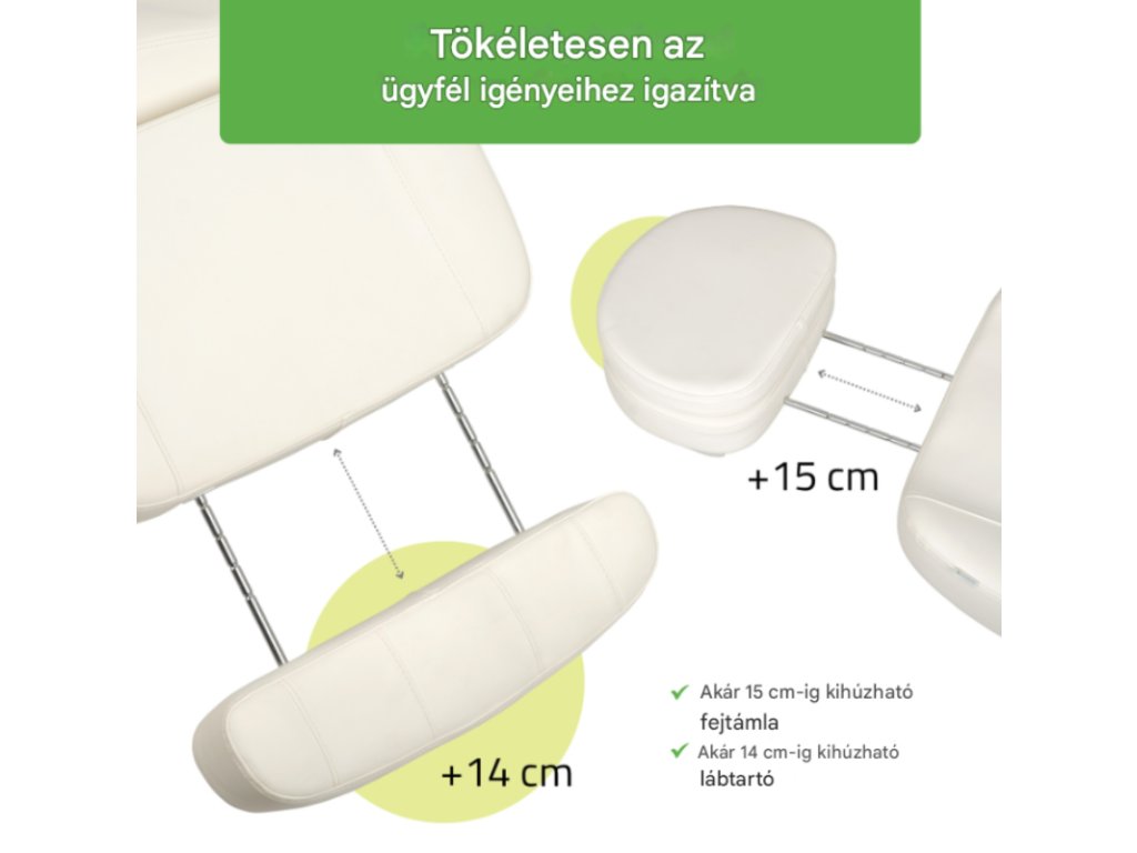 Kihúzható fejtámla (akár 15 cm-ig) és kihúzható lábtámaszok (akár 14 cm-ig)