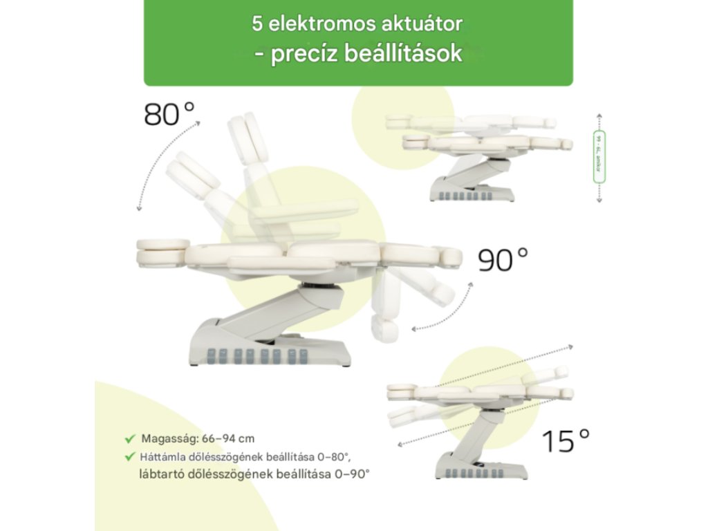 A szék 5 elektromos meghajtással van felszerelve a precíz beállítás érdekében: