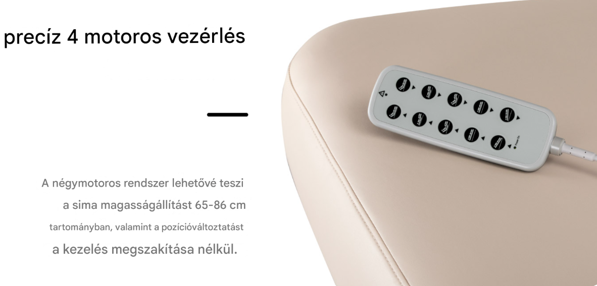 Az intuitív távirányító négy dimenzióban teszi lehetővé a sima beállítást – beleértve a magasságot, a háttámla szögét, a lábtartó dőlésszögét és a billenő funkciót. Az elektromos magasságállítás 65-86 cm között és a precíz dőlésszög-beállítás lehetővé teszi a kanapé pozíciójának tökéletes beállítását az elvégzendő beavatkozás típusához. A széleskörű beállítási lehetőségek megkönnyítik az ergonomikus munkapozíció fenntartását – függetlenül a kezelő magasságától vagy az adott beavatkozástól. A háttámla és a lábtartó egyetlen gombbal történő egyidejű beállításának lehetősége lehetővé teszi az ülő, fekvő vagy fekvő pozíció gyors beállítását – a beavatkozás megszakítása nélkül. A beállítások sima módosítása támogatja az ergonomikus munkafolyamatot és növeli a kliens kényelmét a beavatkozás minden szakaszában.