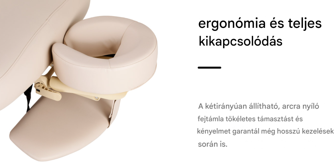 A mellékelt ergonomikus fejtámla arcra nyíló résszel kényelmes fejpozíciót biztosít a háton, hason vagy fekvő helyzetben végzett beavatkozások során. A megfelelő alátámasztás növeli a kliens kényelmét még hosszabb beavatkozások során is, és elősegíti a teljes ellazulást. A fejtámla szöge két síkban állítható , lehetővé téve a beavatkozás típusához és az egyéni igényekhez való pontos beállítást.