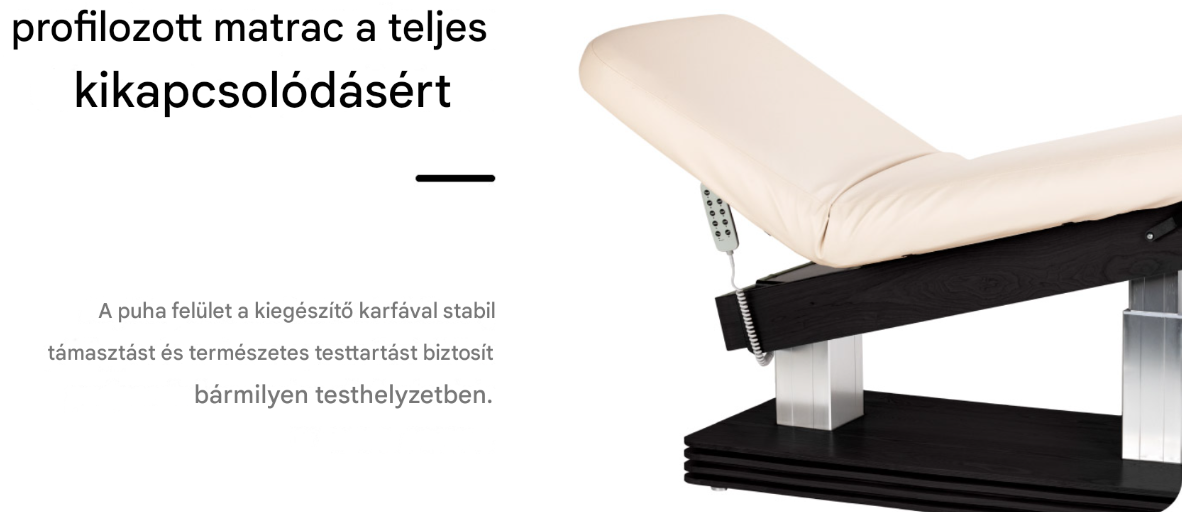 A kanapé kontúrozott felülete természetes, kényelmes testhelyzetet biztosít , stabil és kényelmes támaszt nyújtva teljes hosszában . A megfelelő szélesség és a puha matrac fokozza a kliens kényelmét , különösen hosszabb kezelések során. A nagyobb kényelem jobb kezelési élményt és magasabb színvonalú szolgáltatást jelent a rendelőben. Egy további kartámasz fokozza a kényelmet hason fekvéskor, enyhíti a felsőtestre nehezedő nyomást és elősegíti a teljes ellazulást .