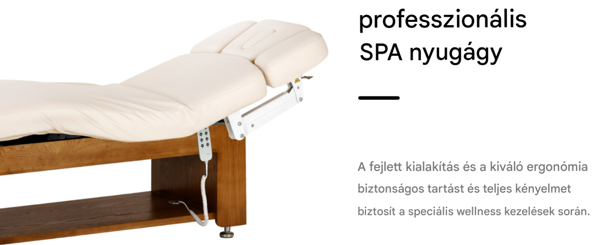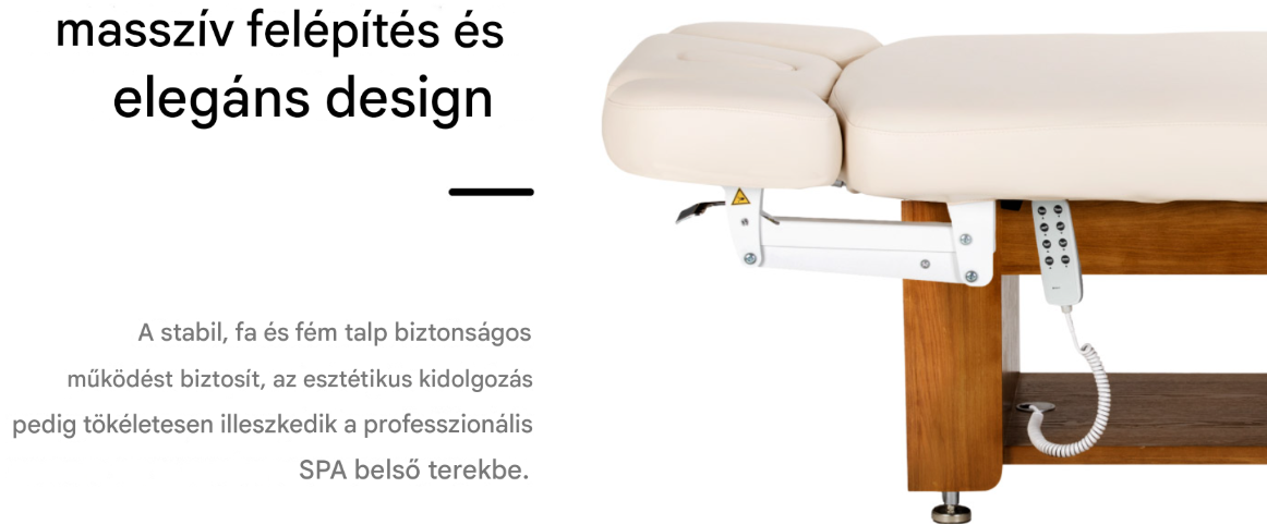 A tömörfa és fém alapzat nagyfokú stabilitást és biztonságot biztosít kozmetikai, bőrápolási és masszázskezelések során. A tartós konstrukció megbízható tartást garantál még intenzív munka során is, elősegítve mind a kliens, mind a kezelő kényelmét. A meleg fa tónus a matrac visszafogott színeivel kombinálva ezt a nyugágyat tökéletes kiegészítőjévé teszi masszázsszalonok, szépségszalonok és wellness-részlegek elegáns belső tereinek. A gondosan kidolgozott részletek hangsúlyozzák a berendezés professzionális jellegét , és egységes, esztétikus képet adnak a rendelőnek.