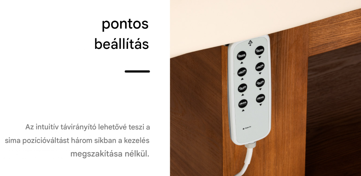 Az intuitív távirányító három dimenzióban teszi lehetővé a sima beállítást : magasság, háttámla és lábtartó. A 65 és 90 cm közötti magasságállítás lehetővé teszi a kezelő magasságához és az eljárás típusához való testreszabást. A széleskörű beállítási lehetőségek megkönnyítik az ergonomikus munkapozíció fenntartását , függetlenül a kezelő magasságától vagy az adott eljárástól. A háttámla és a lábtartó egyetlen gombbal történő egyidejű beállítása lehetővé teszi a gyors ülő, fekvő vagy fekvő helyzetbe állítást az eljárás megszakítása nélkül. A beállítások sima módosítása támogatja az ergonomikus munkafolyamatot és növeli a kliens kényelmét az eljárás minden szakaszában.