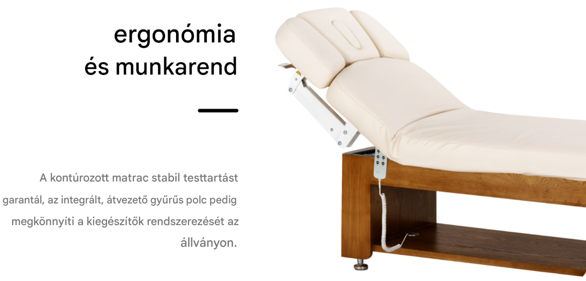 A kanapé kontúrozott felülete természetes, kényelmes testtartást biztosít, stabil és kényelmes támaszt nyújtva . A megfelelő szélesség és a ruganyos matrac kényelmet biztosít még hosszú kezelések és masszázsok során is. A nagyobb kényelem jobb kezelési élményt és magasabb színvonalú szolgáltatást jelent a szalonban. A beépített kábelrendezővel ellátott nyitott polc megkönnyíti a kiegészítők és kozmetikumok rendszerezését , lehetővé téve a rendezett munkaállomást.