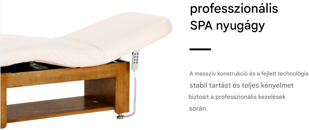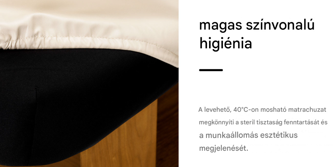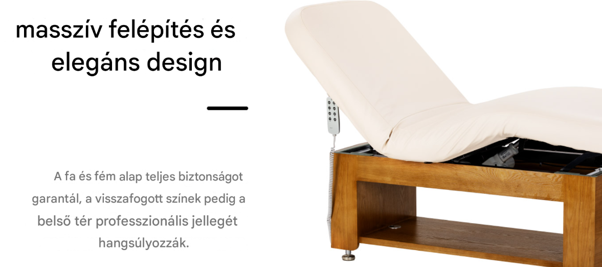 A tömörfa és fém alapzat nagyfokú stabilitást és biztonságot biztosít kozmetikai, bőrápolási és masszázskezelések során. A tartós konstrukció megbízható tartást garantál még intenzív munka során is, elősegítve mind a kliens, mind a kezelő kényelmét. A meleg fa tónus a matrac visszafogott színeivel kombinálva ezt a nyugágyat tökéletes kiegészítőjévé teszi masszázsszalonok, szépségszalonok és wellness-részlegek elegáns belső tereinek. A gondosan kidolgozott részletek hangsúlyozzák a berendezés professzionális jellegét , és egységes, esztétikus képet adnak a rendelőnek.