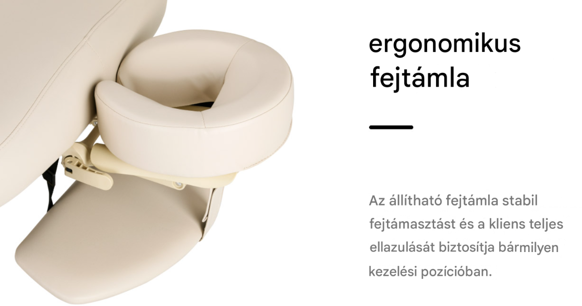 A mellékelt ergonomikus fejtámla arcra nyíló résszel kényelmes fejpozíciót biztosít a háton, hason vagy fekvő helyzetben végzett beavatkozások során. A megfelelő alátámasztás növeli a kliens kényelmét még hosszabb beavatkozások során is, és elősegíti a teljes ellazulást. A fejtámla szöge két síkban állítható , lehetővé téve a beavatkozás típusához és az egyéni igényekhez való pontos beállítást.