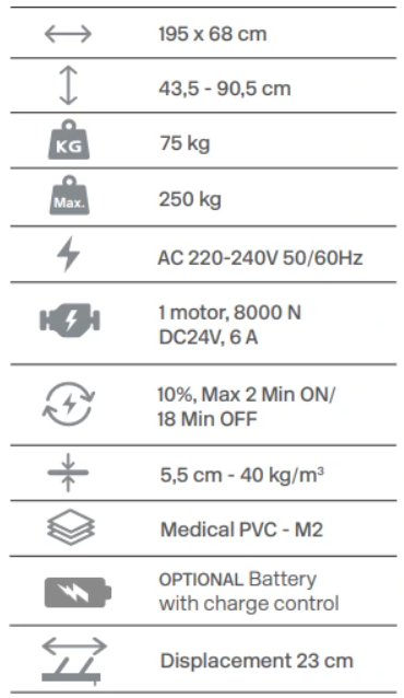 ‑ Kétrészes elektromos asztal fizioterápiás orvostechnikai eszközként való tanúsítvánnyal.