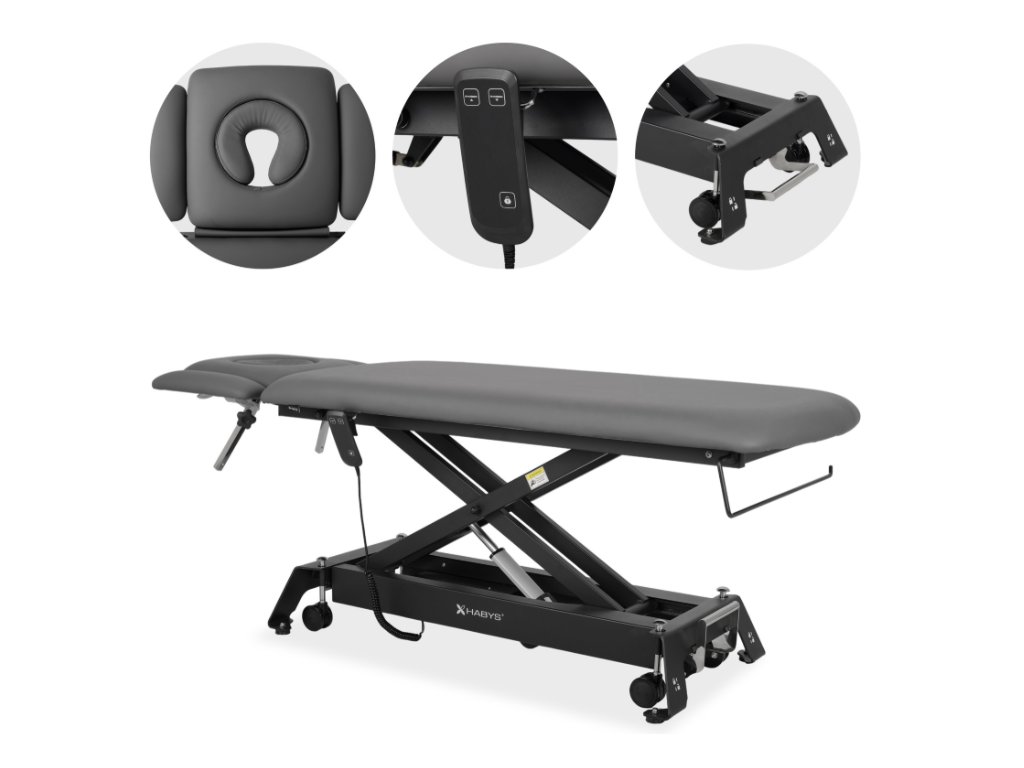 - 4 részes asztallap állítható fejtámlával és karfákkal: Lehetővé teszi a beteg pontos pozicionálását, javítja a terápia hatékonyságát és csökkenti a terapeuta terhelését a hosszú ülések során.