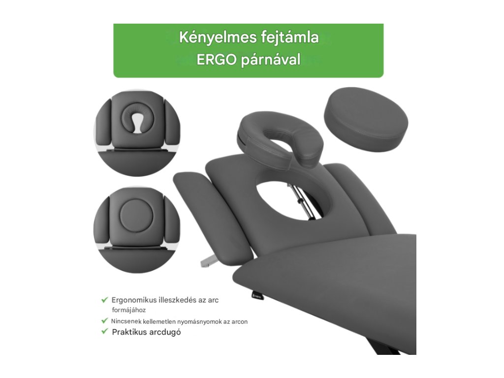 - Állítható fejtámla arckivágással és ERGO párnával: Kivételes kényelmet biztosít mind hanyatt, mind hason fekvő helyzetben, még hosszú és intenzív terápiák során is. A gázrugós mechanizmus lehetővé teszi a szög -60° és +40° közötti beállítását.