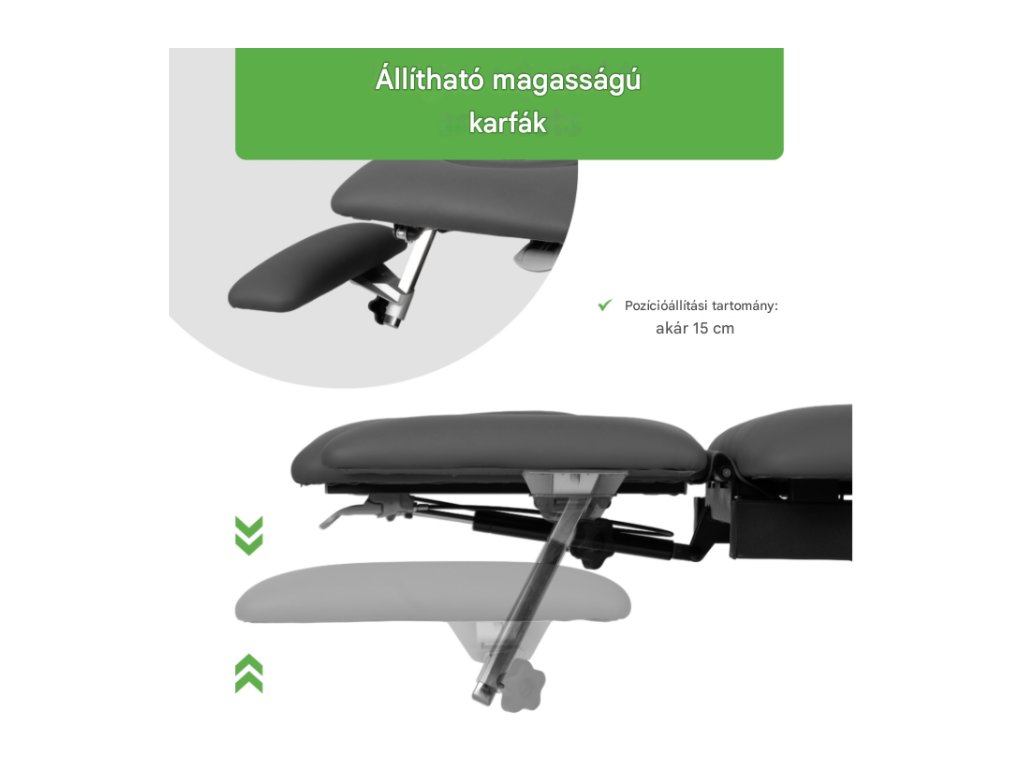 - 4 részes, kényelmes asztallap állítható fejtámlával és karfákkal: A több részből álló konstrukció lehetővé teszi a beteg pontos pozicionálását, ami javítja a terápia hatékonyságát és csökkenti a terapeuta terhelését a hosszú kezelések során. Az asztallap 7,5 cm-es habbal van ellátva, ami biztosítja a kényelmet még hosszabb kezelések során is.