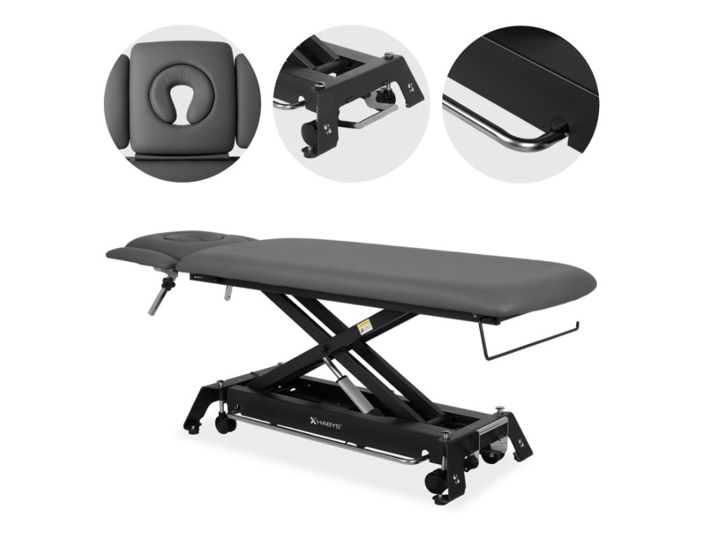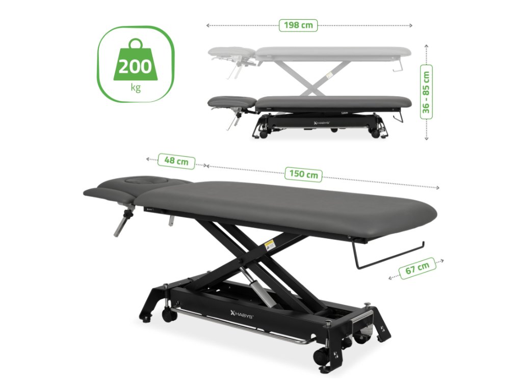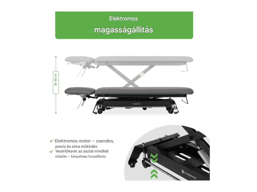 - Elektromos magasságállítás: A csendes és precíz villanymotor biztosítja a sima magasságállítást 36 és 85 cm között. Ez lehetővé teszi a terapeuta számára az ergonomikus munkapozíció fenntartását és a gerinc védelmét. Az alacsony kezdőpozíció a páciens biztonságát is javítja az asztalra való felszállás és leszállás során.