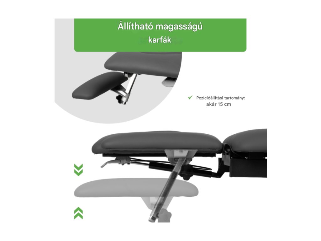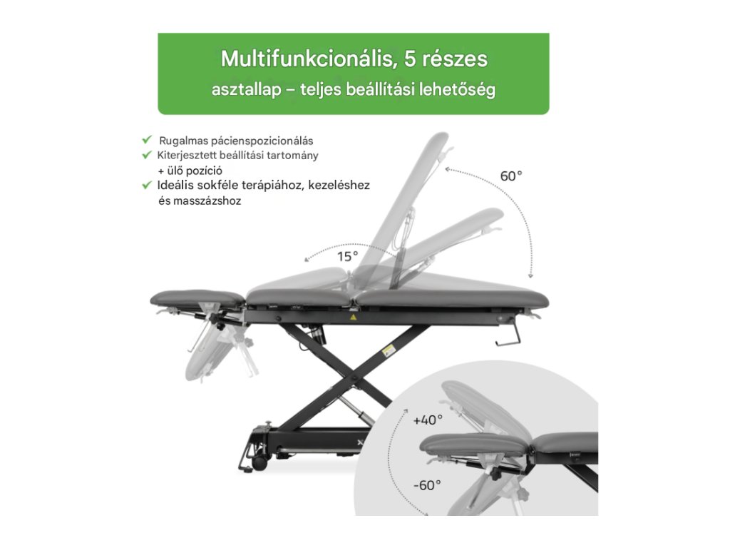 - 5 részes, ergonomikus asztallap teljes állíthatósággal: Minden szegmens külön-külön beállítható, így precíz pozicionálást tesz lehetővé a technikák széles skálájához. A 7,5 cm-es habszivacs bélés kényelmet biztosít még hosszú terápiás ülések során is.