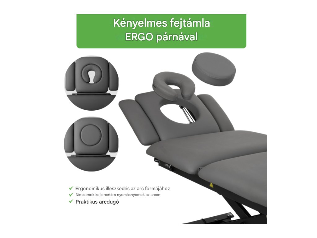 - Állítható fejtámla arcformáló lyukkal és ERGO párnával: Kényelmes fekvésben és háton fekvésben egyaránt. A gázrugós rendszer lehetővé teszi a fejtámla szögének –60° és +40° között történő beállítását.