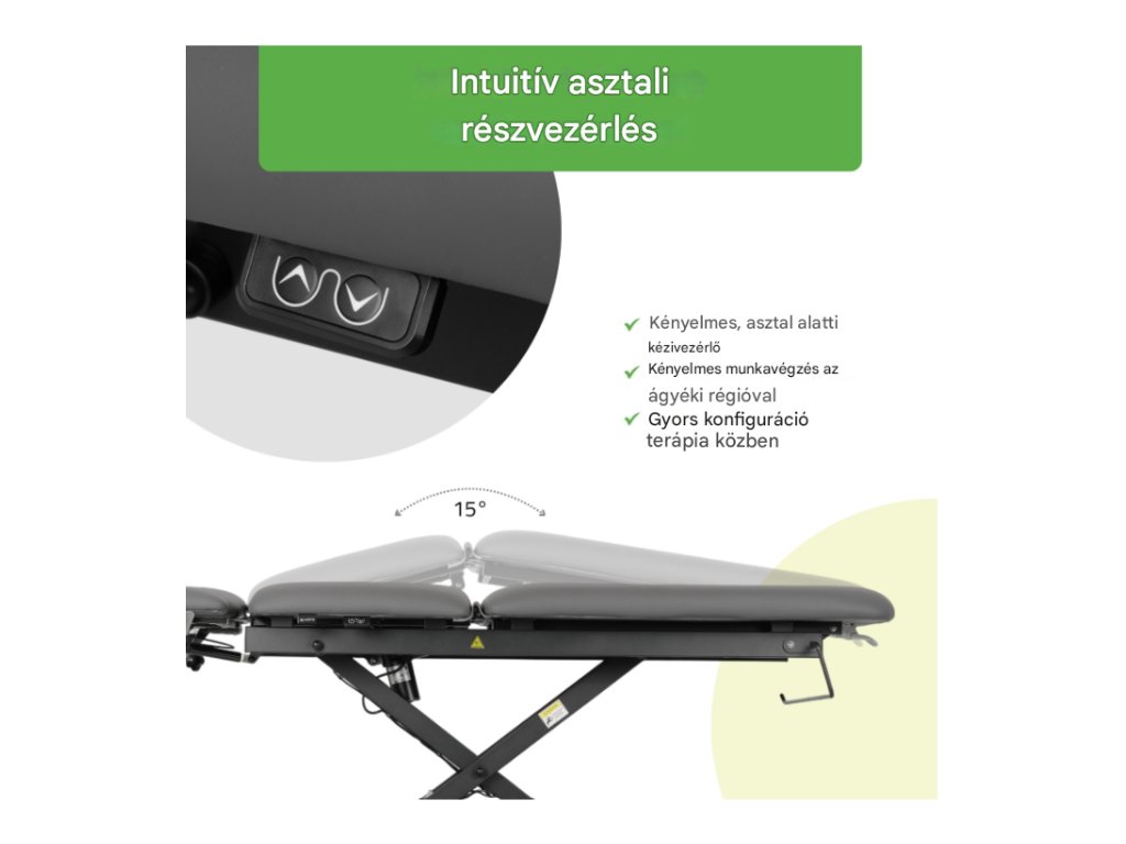 - Asztal alatti kézivezérlő az ágyéki és medencei szakasz szabályozásához: Támogatja a medence és az ágyéki gerinc pontos pozicionálását fasciális, mobilizációs, relaxációs és nyirokelvezetéses technikák során. A kézivezérlő kényelmesen az asztallap alatt található, lehetővé téve a gyors beállításokat a terápiás kontaktus megszakítása vagy a terapeuta testhelyzetének megváltoztatása nélkül.
