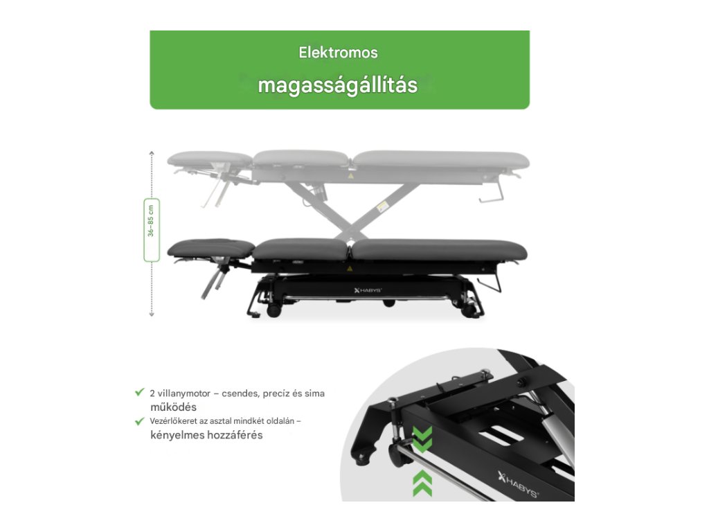 - Elektromos magasságállítás: Két villanymotor biztosítja az asztal magasságának (36–85 cm) és az ágyéki szakasz csendes, precíz és sima állítását. Ez javítja a terapeuta ergonómiáját és biztosítja a páciens kényelmét. Az alacsony kezdőmagasság növeli a biztonságot az asztalra való felszállás és leszállás során.