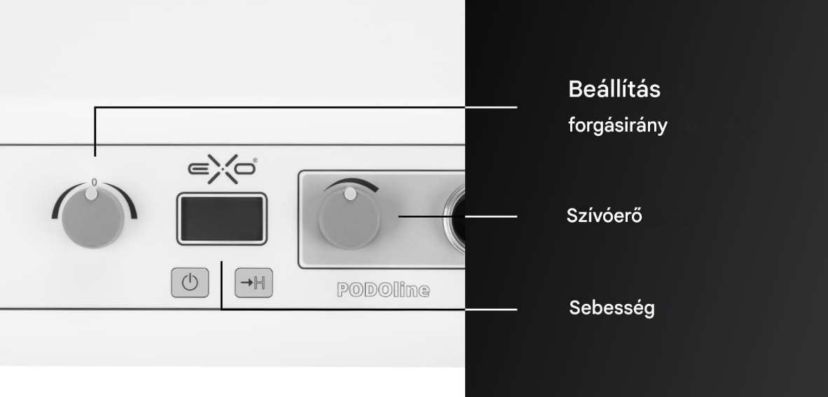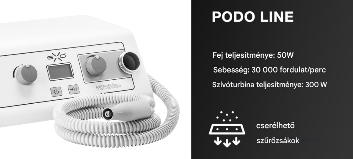 Az EXO Podo Line marógép , amelyet az orvostechnikai eszközökre vonatkozó 93/42/EGK irányelvnek megfelelően gyártottak, garantálja a minőséget és a biztonságot. Professzionális pedikűr kezelésekhez és lábbetegségek kezelésére tervezték. Képzett lábápolók és lábápolók számára ajánlott.