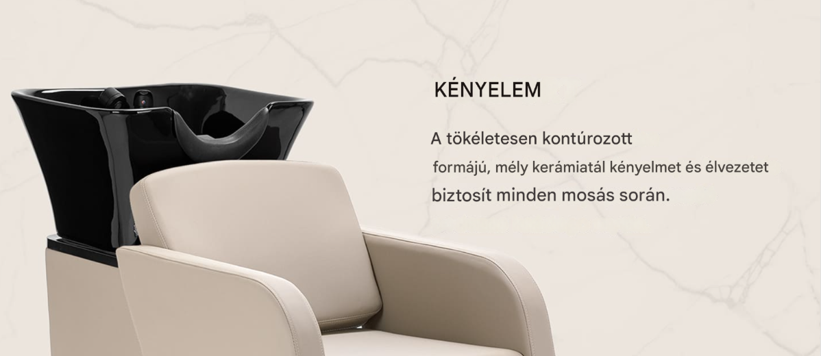 A fekete kerámia mosogató modern formájával és megfelelő mélységével hatékonyan megakadályozza a víz és a kezelések során használt termékek kifröccsenését , lehetővé téve a szolgáltatások széles skálájának kényelmes és hatékony elvégzését . A kontúrozott gallér és a ferde háttámla kényelmet és támasztást biztosít a hajmosás során , míg a fekete műanyag borítás védi a klienst a hideg kerámiafelülettől, biztosítva a kellemes élményt a kezelés során.