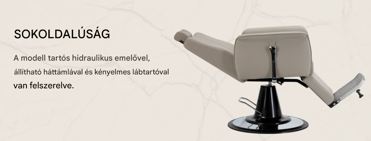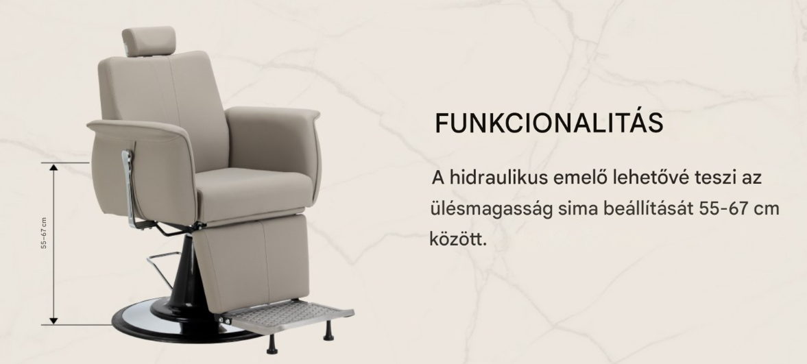Az erőteljes hidraulikus emelő lehetővé teszi az ülésmagasság sima állítását 55-67 cm között , még akkor is, ha az ügyfél már ült. Ez ergonomikus munkakörülményeket biztosít , és megkönnyíti a beállítások hozzáigazítását mind az ügyfél, mind a borbély magasságához. A dönthető háttámla és az állítható lábtartó lehetővé teszi, hogy az ügyfél kényelmes, félig fekvő pozícióba helyezkedjen el , növelve a kényelmet bizonyos szolgáltatások során. Az állítható fejtámla stabil fej- és nyaktámaszt biztosít .