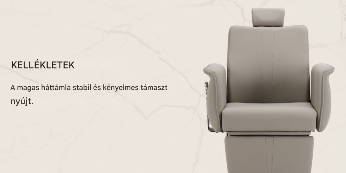 A kényelmes ülés biztosítja a kliens kényelmét a különféle szolgáltatások során . A magas háttámla szilárd támaszt nyújt , elősegítve a kényelmes és stabil testtartást. A teljes forgómechanizmus növeli a mozgásszabadságot és egyszerűsíti a munkafolyamatot. Az optimális magasságban elhelyezett kárpitozott karfák megtámasztják a kliens megfelelő kartartását , csökkentve a váll terhelését.