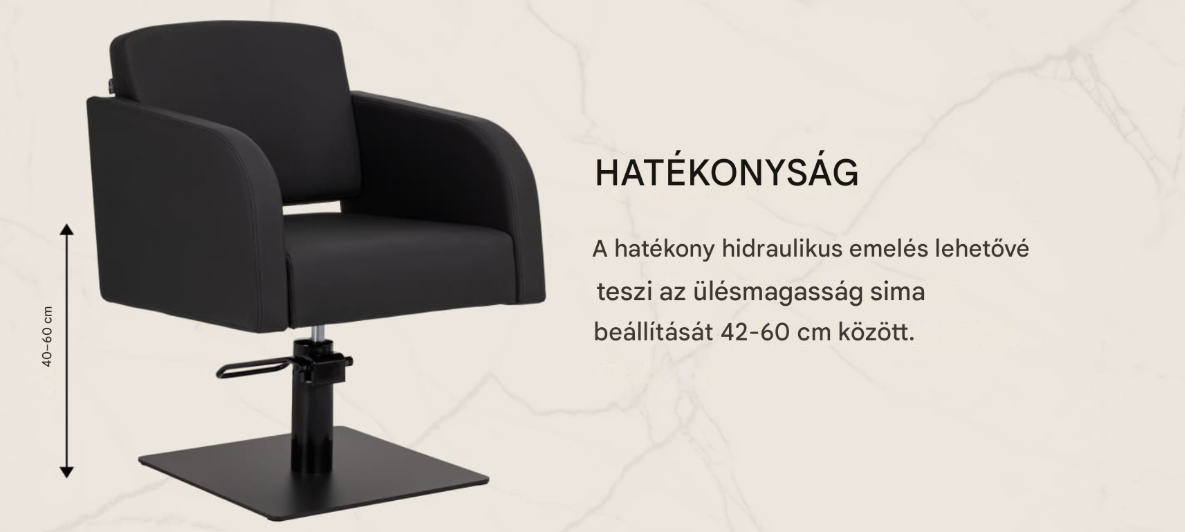 A tartós hidraulikus emelő lehetővé teszi az ülésmagasság sima állítását 42 és 60 cm között , még akkor is, ha a kliens a székben ül. Ez ergonomikus munkát tesz lehetővé, és a pozíció könnyen beállítható mind a kliens, mind a fodrász magasságához igazítva. A kényelmes háttámla megkönnyíti a kényelmes testtartást, és stabil háttámaszt biztosít , ami különösen fontos a hosszú kezelések során, miközben növeli a kliens kényelmét és elégedettségét is .