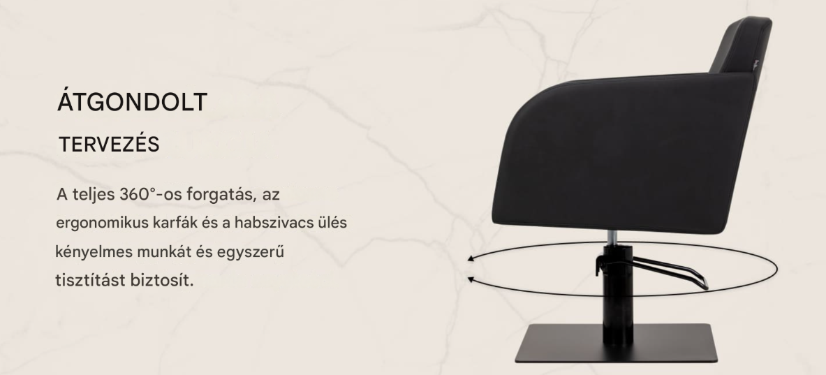 A teljesen forgó mechanizmus növeli a mobilitást és a mozgásszabadságot, így a fodrászmunka simább, hatékonyabb és kevésbé megerőltető. A habbal párnázott ülés nagy kényelmet biztosít még hosszú kezelések során is. Az ergonomikus kartámaszok támogatják a vendég helyes testtartását, biztosítva a precíz vágáshoz és formázáshoz szükséges kényelmet és stabilitást . Praktikus tulajdonság a háttámla és az ülés közötti nyílás, amely megkönnyíti a tisztítást azáltal, hogy gyorsan eltávolítja a szőrszálakat a nehezen elérhető helyekről. Ez lehetővé teszi az állomás hatékony és higiénikus előkészítését a következő vendég számára .