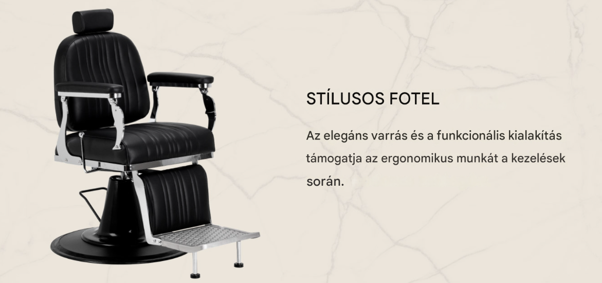 A kényelmes ülés biztosítja a kliens kényelmét a különféle szolgáltatások során . A kontúros háttámla stabil, kényelmes testtartást biztosít , és szilárd háttámaszt nyújt, ami különösen fontos a hosszabb kezelések során. A teljes forgómechanizmus növeli a mozgásszabadságot és nagyobb munkahatékonyságot eredményez. A kárpitozott karfák lehetővé teszik a vállak megfelelő pozicionálását , megakadályozva, hogy a kliens felemelje a karját és görnyedjen, ami jelentősen megkönnyíti a borbély számára a precíz kezeléseket .