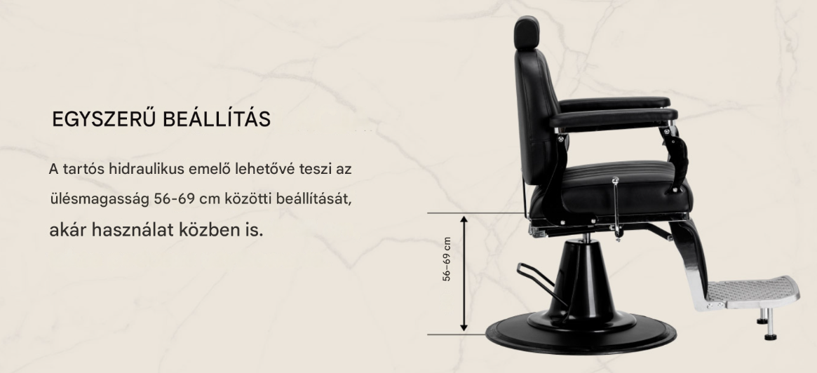 A tartós hidraulikus emelő lehetővé teszi az ülésmagasság egyszerű állítását 56 és 96 cm között , még ülő helyzetben is. Ez ergonomikus munkavégzést és az ülésmagasság egyszerű beállítását teszi lehetővé a kliens és a kezelést végző személy magasságához igazítva. Ez a modell dönthető háttámlával és állítható lábtartóval van felszerelve, amely lehetővé teszi a kliens kényelmes, félig fekvő helyzetbe helyezését , és jobb hozzáférést biztosít bizonyos szolgáltatások során. Ezenkívül a 20 cm-rel kihúzható fejtámla stabil és kényelmes fejtámaszt biztosít , amelyet az egyéni igényekhez igazítanak.