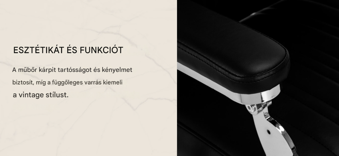 A stabil talp szilárd támaszt és magas kényelmet biztosít . A deformációálló habbal töltött ülőfelület és a félmatt műbőrből készült kárpitozás tartósságot és hosszú távú kényelmet garantál . Az anyagok nedvességállóságukkal és könnyű tisztíthatóságukkal tűnnek ki. A fekete kárpitozás, a krómozott fém elemekkel és a dekoratív lábtartóval kombinálva jellegzetes, klasszikus jelleget kölcsönöz a széknek . A függőleges varrás hangsúlyozza a vintage stílust , tökéletesen illeszkedve a professzionális fodrászatok hangulatához. A gondosan kidolgozott részletek reprezentatív megjelenést kölcsönöznek az egész darabnak , míg a funkcionális kialakítás elősegíti a kényelmes és hatékony munkát .