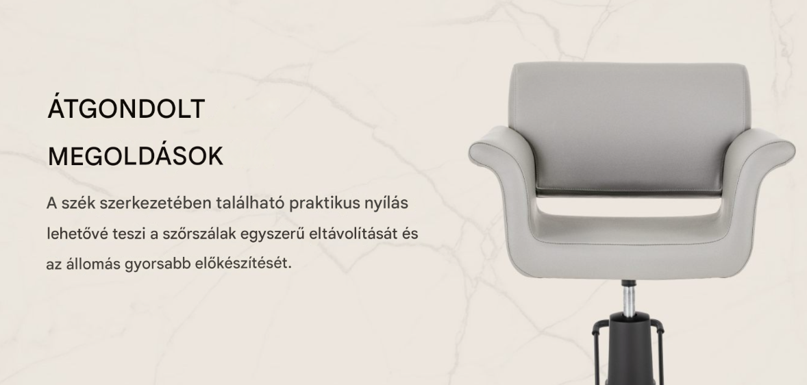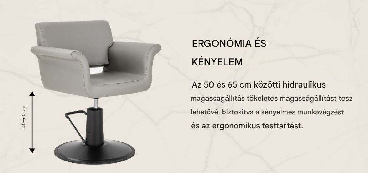 A robusztus hidraulikus emelő lehetővé teszi az ülésmagasság sima állítását 50 és 65 cm között , még akkor is, ha a kliens ül a székben. Ez lehetővé teszi a könnyű beállítást mind a kliens, mind a fodrász magasságához, elősegítve az ergonomikus testtartást munka közben. A kényelmes háttámla stabil háttámaszt nyújt , biztosítva a kényelmet még hosszú kezelések során is. A teljes forgómechanizmus növeli a mozgásszabadságot, és lehetővé teszi a klienshez való könnyű hozzáférést minden oldalról.