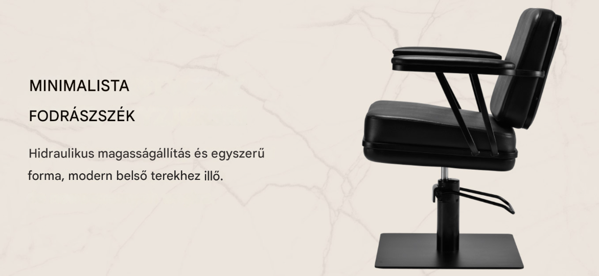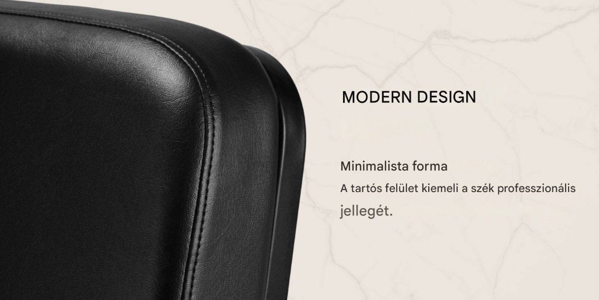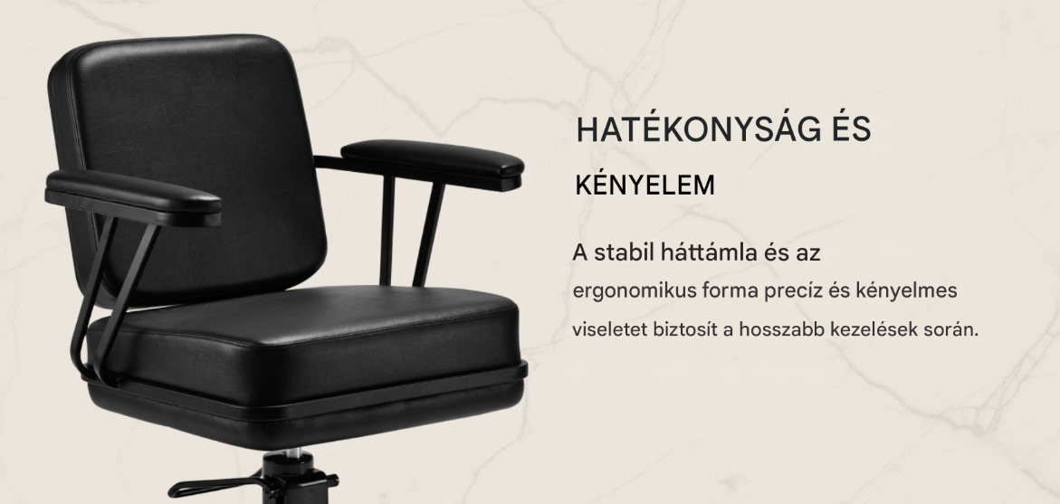A kontúrozott fotel deréktámaszt és magas kényelmet biztosít , míg a kárpitozott karfák lehetővé teszik a váll megfelelő pozicionálását. A stabil, szögletes, matt fekete alap fokozza a stílusos megjelenést , míg a puha tapintású, fekete árnyalatú műbőr garantálja a kényelmet a hosszú kezelések során, a tartósságot, a nedvességállóságot és a könnyű tisztíthatóságot . A modern dizájn egyedi karaktert kölcsönöz bármilyen belső térnek , és a fotel jól működik mind a modern, mind a klasszikus enteriőrökben, kiemelve a szalon professzionális arculatát .