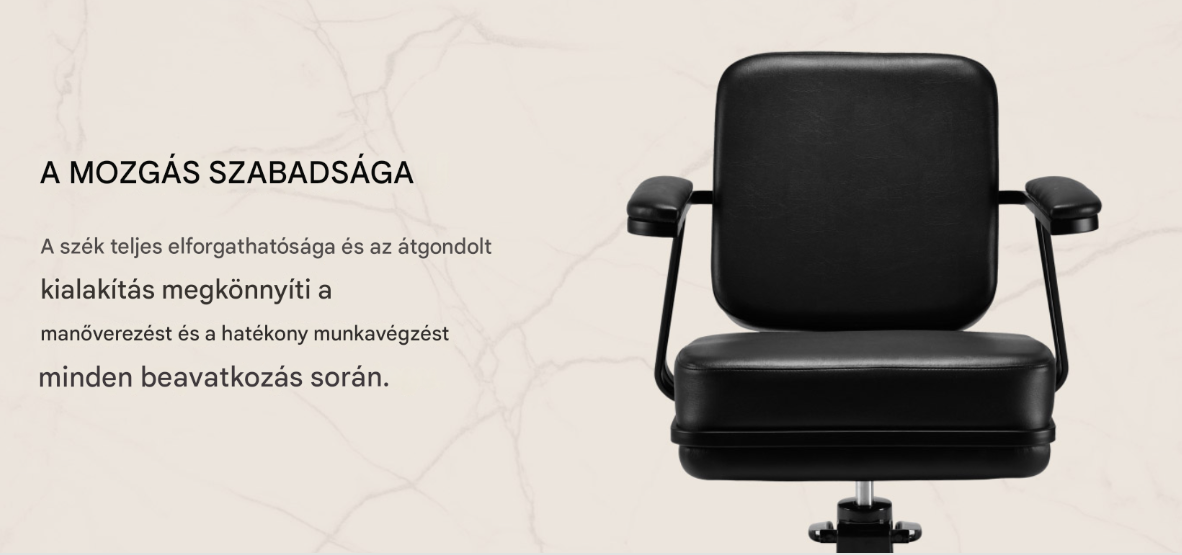 A szék kialakítását a kényelem szem előtt tartásával tervezték , még hosszabb kezelések során is. A kontúrozott ülés és az ergonomikus karfák alátámasztják a kliens természetes testtartását, megkönnyítve a precíz munkát. A teljes forgómechanizmus növeli a mozgástartományt és a manőverezhetőséget, ami zökkenőmentes és hatékony szolgáltatást eredményez .