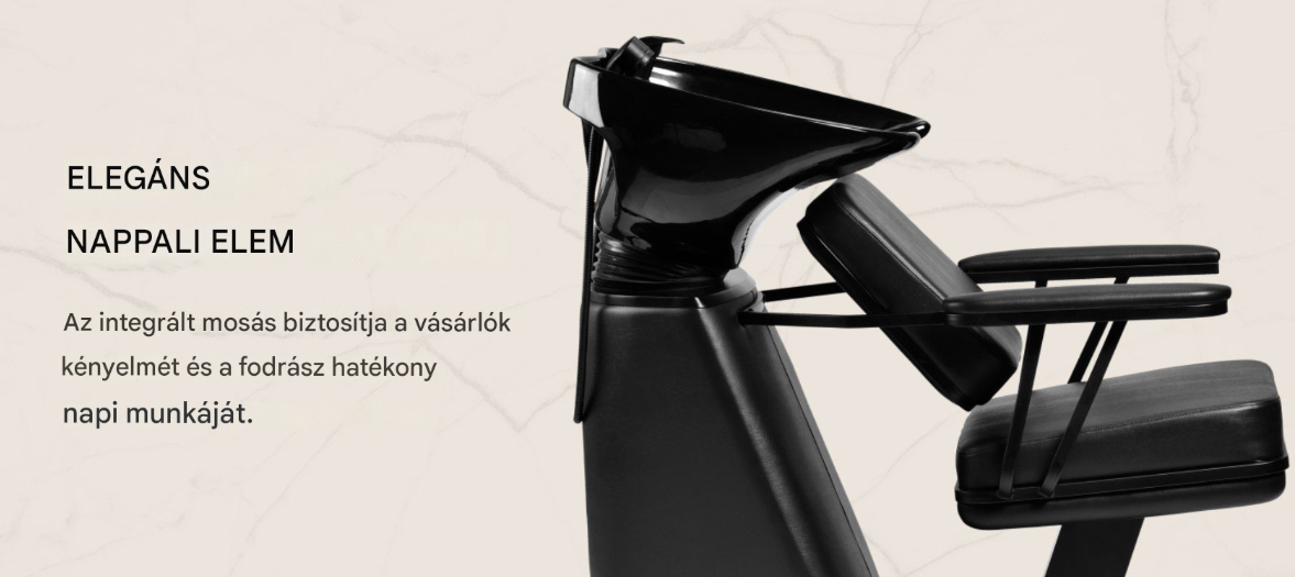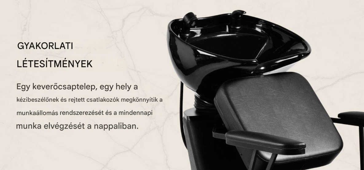 A mosóegység keverőcsappal van felszerelve, így a víz hőmérséklete könnyen a vendég igényeihez igazítható. A különálló kézibeszélő-tartó és a krómozott lefolyó, valamint a speciális szűrő leegyszerűsíti a munkafolyamatot, és segít fenntartani a magas higiéniai színvonalat a szalonban . A vízcsatlakozás az alapzatban található, így a berendezés könnyen elrejthető. A mosóegység kontúrja úgy van kialakítva, hogy kényelmet biztosítson a különféle kezelések során, és megfelelő háttámaszt nyújtson. A funkcionalitás és a praktikus kényelem kombinációja még kényelmesebbé teszi a fodrászszalonban való munkát .