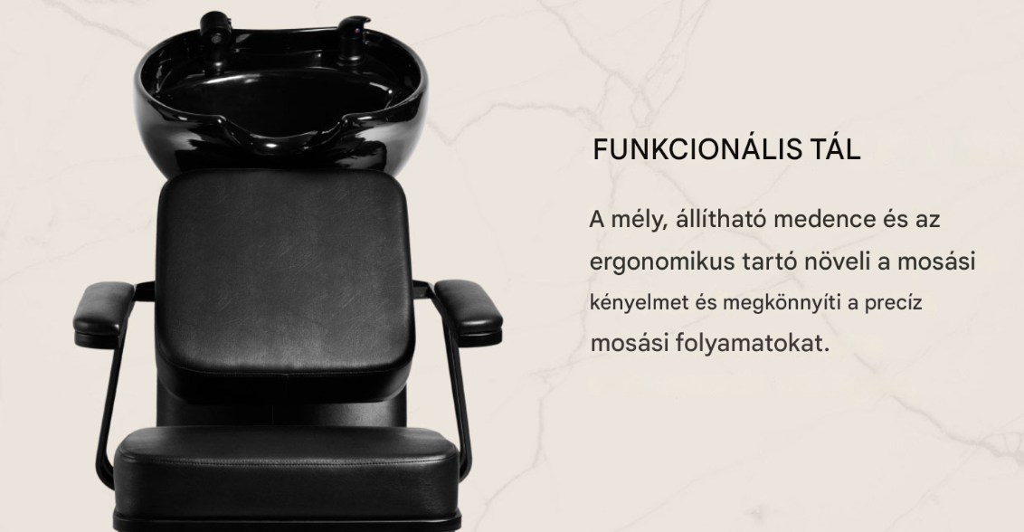 A fodrászok és a vendégek kényelmét szem előtt tartva tervezett fekete kerámia tál lehetővé teszi a fodrászati szolgáltatások széles skálájának hatékony elvégzését , megfelelő mélysége pedig csökkenti a kezelések során használt víz és termékek fröccsenését. Az állítható dőlésszög lehetővé teszi az egyéni igényekhez való testreszabást, míg a kiváló minőségű anyagok tartósságot, folt- és karcállóságot , valamint könnyű tisztíthatóságot biztosítanak. A kontúrozott gallér és a ferde háttámla kényelmes támaszt nyújt hajmosás közben , míg a kényelmes fekete műanyag borítás kiküszöböli a kerámia felület kellemetlen hidegérzetét.