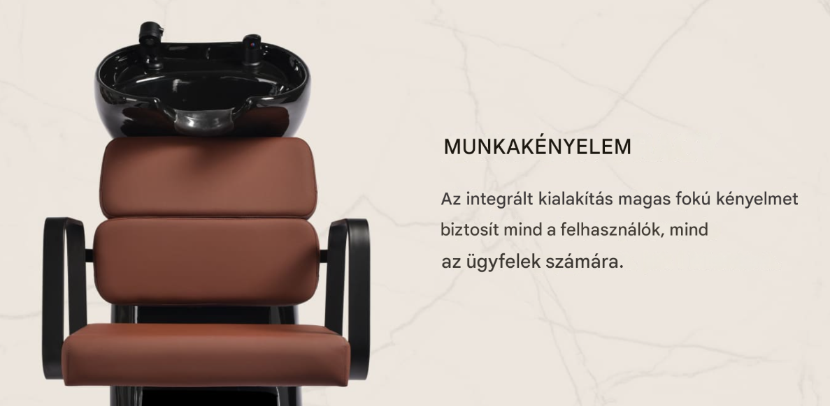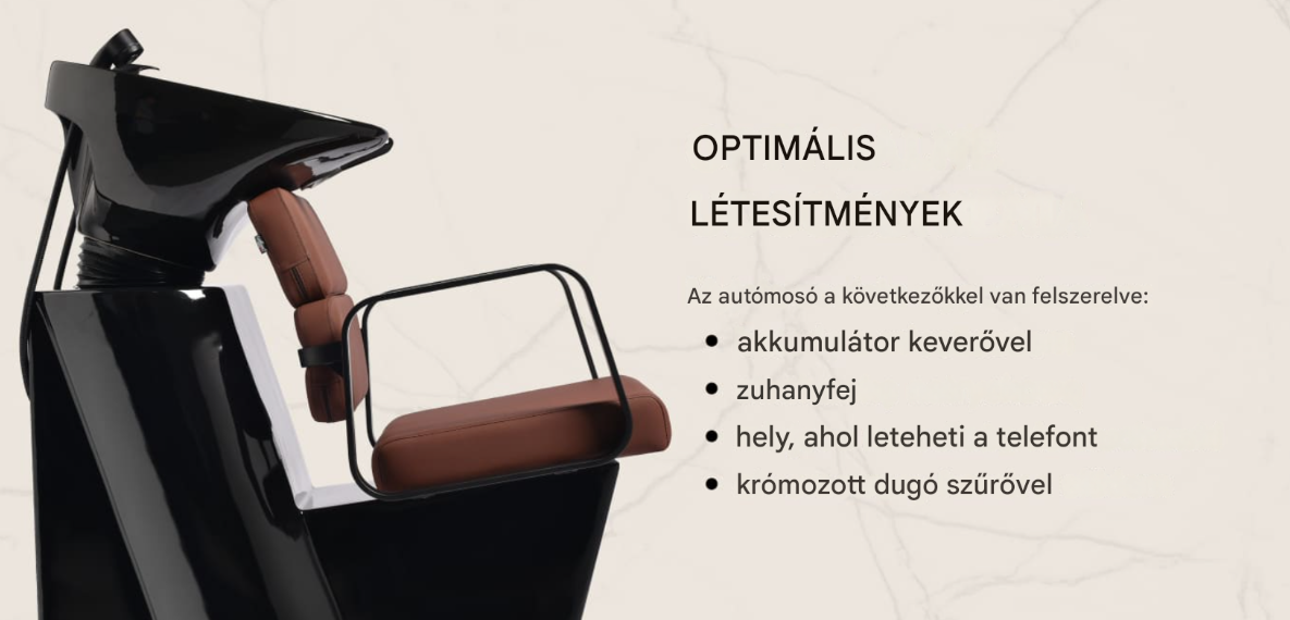 Ez a praktikus mosdóállomás keverőcsappal van felszerelve, amely könnyű hozzáférést biztosít a meleg és hideg vízhez . Így a hőmérséklet könnyen a vendég egyéni igényei szerint állítható. A kézibeszélő felakasztására szolgáló hely leegyszerűsíti a munkát, míg a krómozott dugó speciális szűrővel lehetővé teszi a vízáramlás szabályozását és a szalon magas higiéniai színvonalának fenntartását. A vízcsatlakozás az alapzaton belül található , lehetővé téve a csövek hatékony elrejtését. Ennek a modellnek a jelentős előnye a háttámla és az ülőke közötti nyílás , amely megkönnyíti a szalon tisztítását azáltal, hogy lehetővé teszi a szennyeződések könnyű seprését a szék minden sarkából. A mosóállomás kontúrja kényelmes a különböző kezelések során, garantálva a megfelelő háttámaszt . A funkcionalitás és a kényelem ezen kombinációja még kényelmesebbé teszi a fodrászatban végzett munkát .