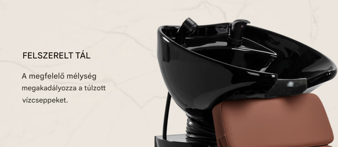 A fekete kerámia mosogatótál megfelelő mélysége megakadályozza a víz vagy a kezelések során használt termékek túlzott fröccsenését. Ez lehetővé teszi a szolgáltatások széles skálájának kényelmes és hatékony elvégzését . A csésze dőlésszöge állítható, így könnyen az egyéni igényekhez igazítható . A felhasznált kiváló minőségű anyagok tartóssá, elszíneződés- és karcállóvá, valamint nagyon könnyen tisztíthatóvá teszik a mosogatót . A megfelelően kontúrozott perem és a szögletes háttámla tartást és kényelmet biztosít a hajmosás során, a kényelmes fekete műanyag borításnak köszönhetően pedig a vendégek nem érzik a hűvös kerámiafelület okozta kellemetlenségeket.