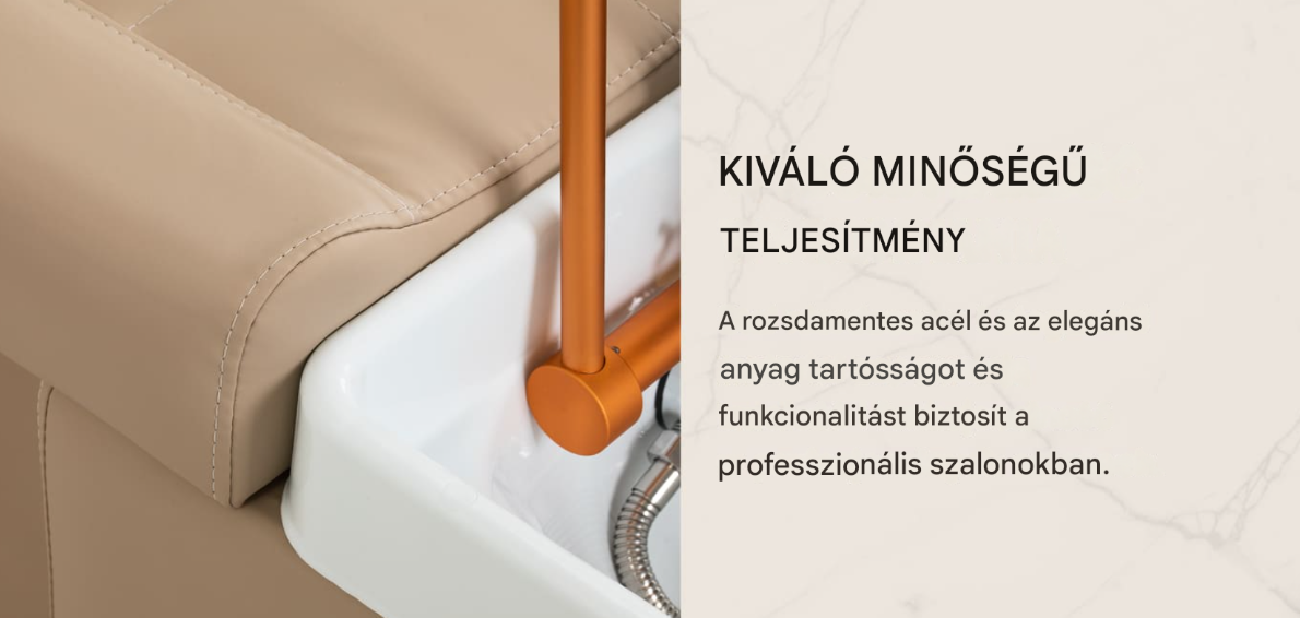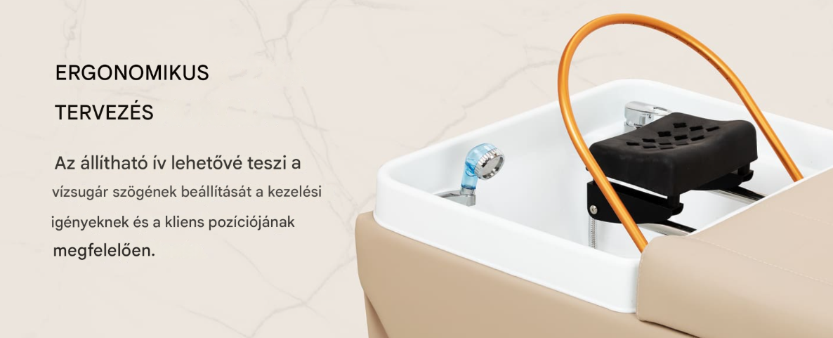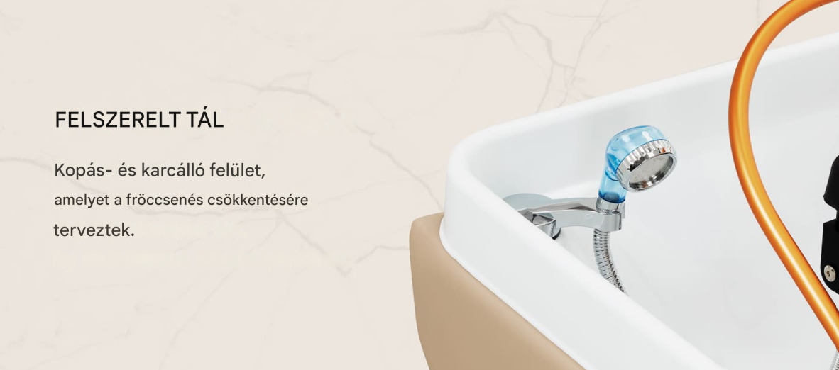 A mosdóállomás keverőcsappal van felszerelve, amely lehetővé teszi a víz hőmérsékletének pontos beállítását a felhasználó igényei szerint . A zuhanyfejnek kialakított hely leegyszerűsíti a munkafolyamatot, míg a krómozott, speciális szűrővel ellátott kupak biztosítja a vízáramlás szabályozását és a magas higiéniai szint fenntartását . A vízcsatlakozás az alapzaton belül, a szövet mögött található, elrejtve a beszerelést és elegáns megjelenést kölcsönözve az egész egységnek. Az ergonomikusan kialakított nyugágy garantálja a kényelmet a különböző kezelések során. Egy praktikus puff egészíti ki az egységet , növelve a személyzet kényelmét és fokozva az egység funkcionalitását. Ezek a tulajdonságok ideálissá teszik a mosdóállomást mind fodrászatok, mind wellness központok számára.