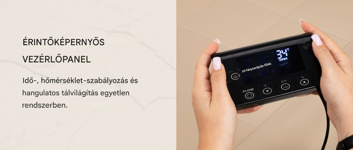 Az intuitív érintőpanel lehetővé teszi a kezelési paraméterek teljes körű ellenőrzését és a könnyű használatot. Lehetővé teszi a víz hőmérsékletének beállítását és az aktuális értékek nyomon követését egy tiszta, könnyen leolvasható kijelzőn. Ezenkívül a panel lehetővé teszi a fényterápia funkció aktiválását , amely megvilágítja a gőzfürdőkádat, pihentető és luxus légkört teremtve . A készlet tartalmaz egy távirányítót is a gőzterápiás készülék kényelmes távvezérléséhez .