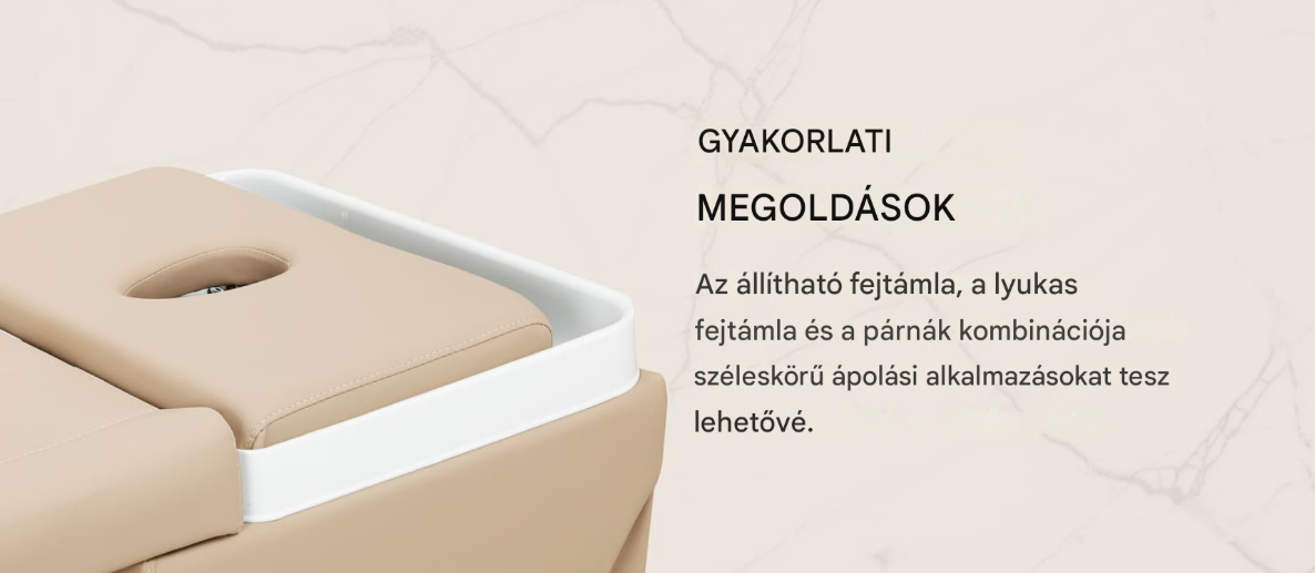 Az állítható fejtámla kihúzható és dönthető funkciójával tökéletesen illeszkedik a felhasználó igényeihez , biztosítva a maximális kényelmet. A szett ergonomikus párnákat is tartalmaz , beleértve az arcra nyíló fejtámlát, amely bővíti az alkalmazások körét – a fejbőrkezelésektől a masszázsokon át a különféle test- és arcterápiákon át. Ezek a praktikus tulajdonságok sokoldalú eszközzé teszik a nyugágyat a szépség- és wellness szalonok számára, ötvözve a vendégek kényelmét a szakemberek által igényelt funkcionalitással.