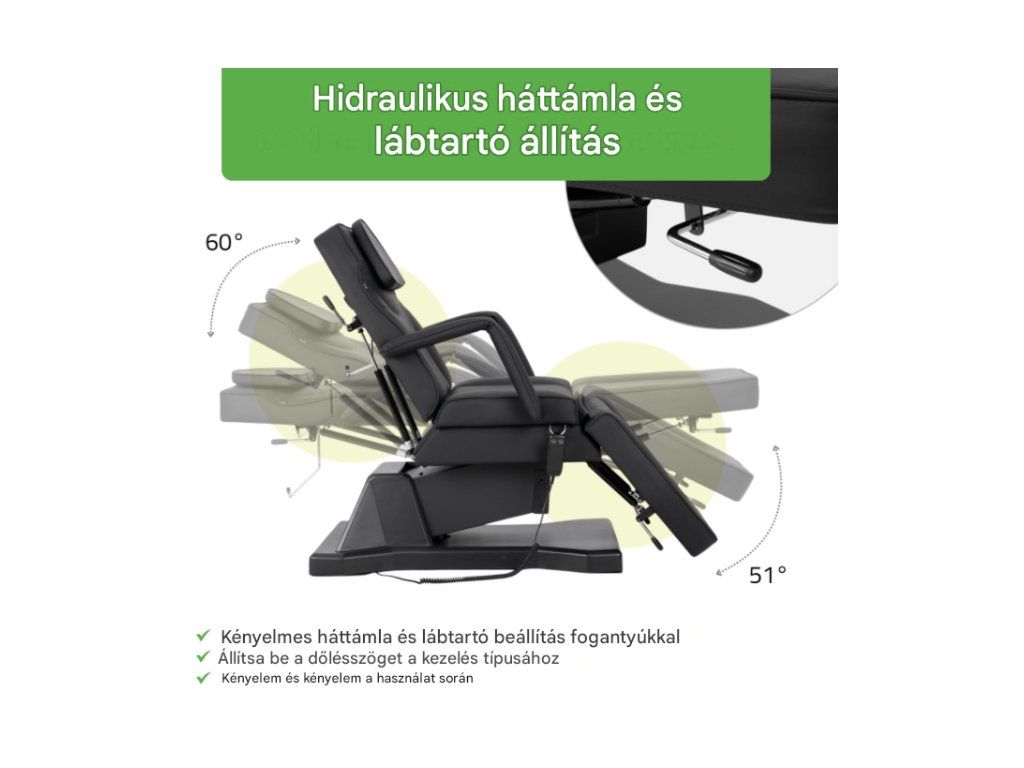 A hidraulikus állítómechanizmus lehetővé teszi a háttámla és a lábtartó szögének sima beállítását. Ez lehetővé teszi a szék gyors fekvő helyzetbe állítását, amely számos szépségápolási és ápolási kezeléshez alkalmas. -