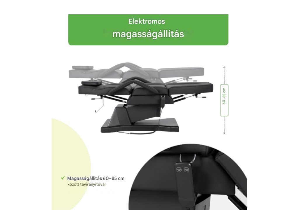 A szék elektromos magasságállító rendszerrel van felszerelve, amely távirányítóval működtethető. A 60–85 cm-es állíthatósági tartomány lehetővé teszi a munkapozíció testreszabását a kezelés típusához és a szakember magasságához, növelve a kényelmet munka közben. -