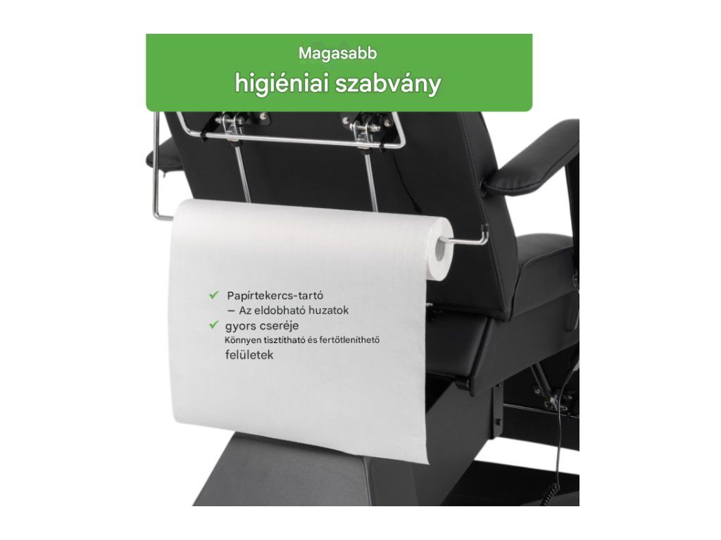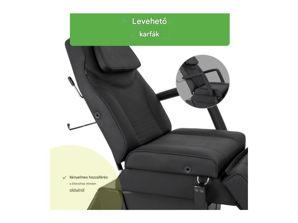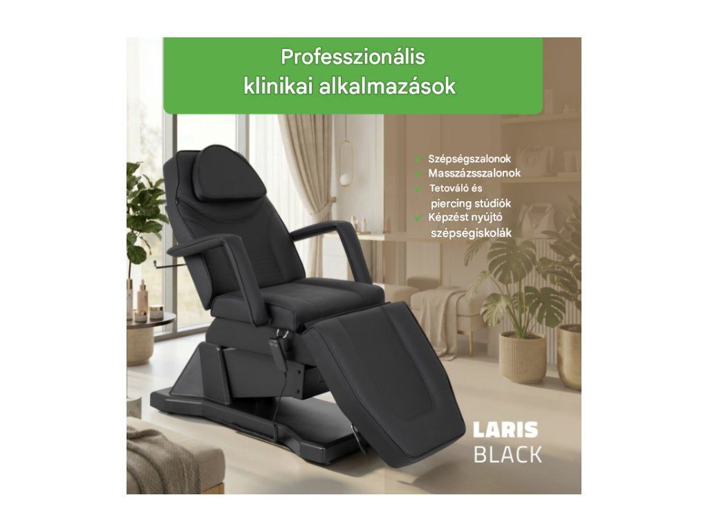 A Laris elektromos szépségfotel egy elegáns és funkcionális berendezés szépségszalonok számára. Az elektromos magasságállításnak, a háttámla és a lábtartó beállításának lehetőségével a szék kényelmes, az elvégzendő kezelés típusához igazított pozíciót tesz lehetővé, így mind a kliens, mind a szakember számára kényelmes.