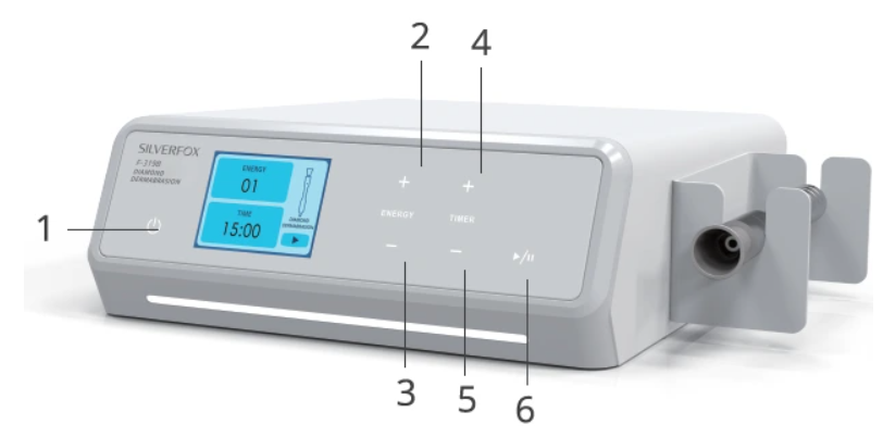 6. A kezelés befejezése után nyomja meg a bekapcsológombot a készülék kikapcsolásához. Ekkor a bekapcsológomb pirosan világít. A tápkábel kihúzása után tisztítsa meg a tapadókorongot és a mikrokristályos őrlőfejet 75%-os alkohollal, és tárolja azokat száraz helyen.
