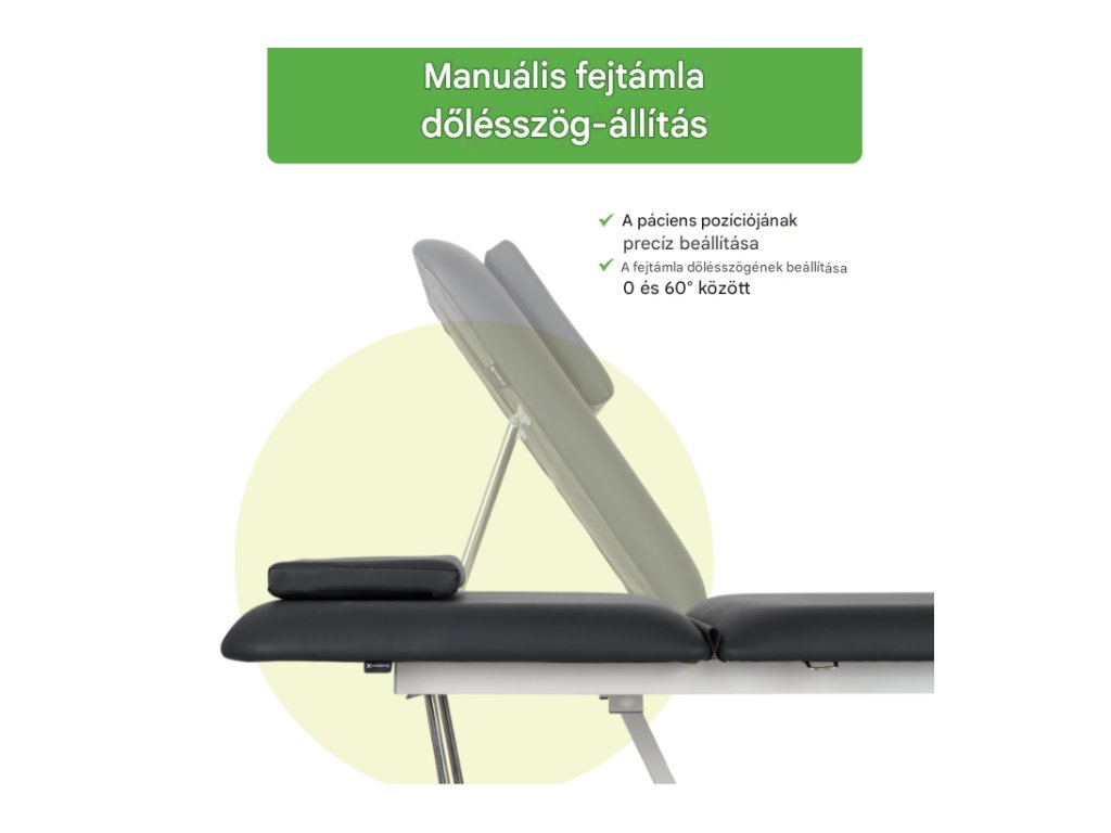 A fejtámla szögének manuális beállítása lehetővé teszi a beteg gyors pozicionálását a terápiás igényeknek megfelelően. Az arckivágás lehetővé teszi a szabad légzést hason fekvő helyzetben. Szükség esetén egy nagyméretű párnával letakarható a nyílás, így biztosítva a kényelmes pozicionálást hanyatt vagy oldalfekvő helyzetben. -