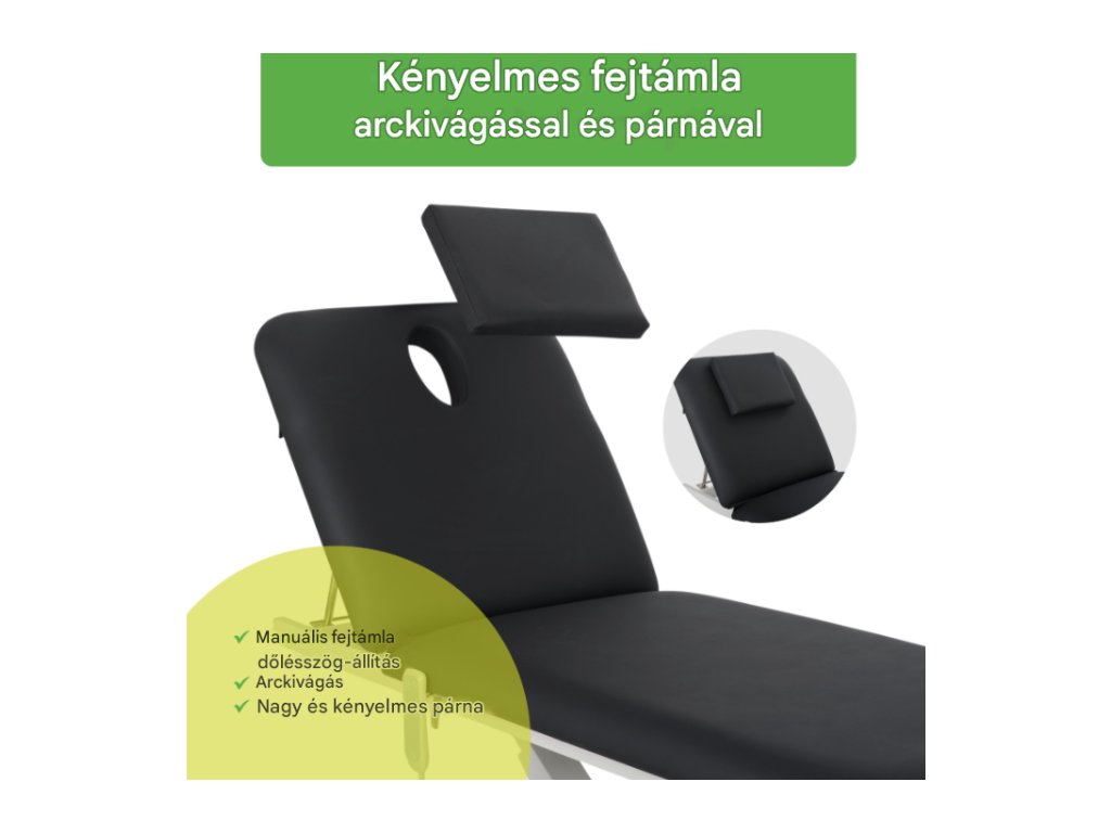 A kényelmes, 182 × 68 cm-es fekvőfelület két részből áll: egy fejtámlából és a fő asztallapból. Az állítható fejtámla lehetővé teszi a nyaki gerinc megfelelő beállítását. -