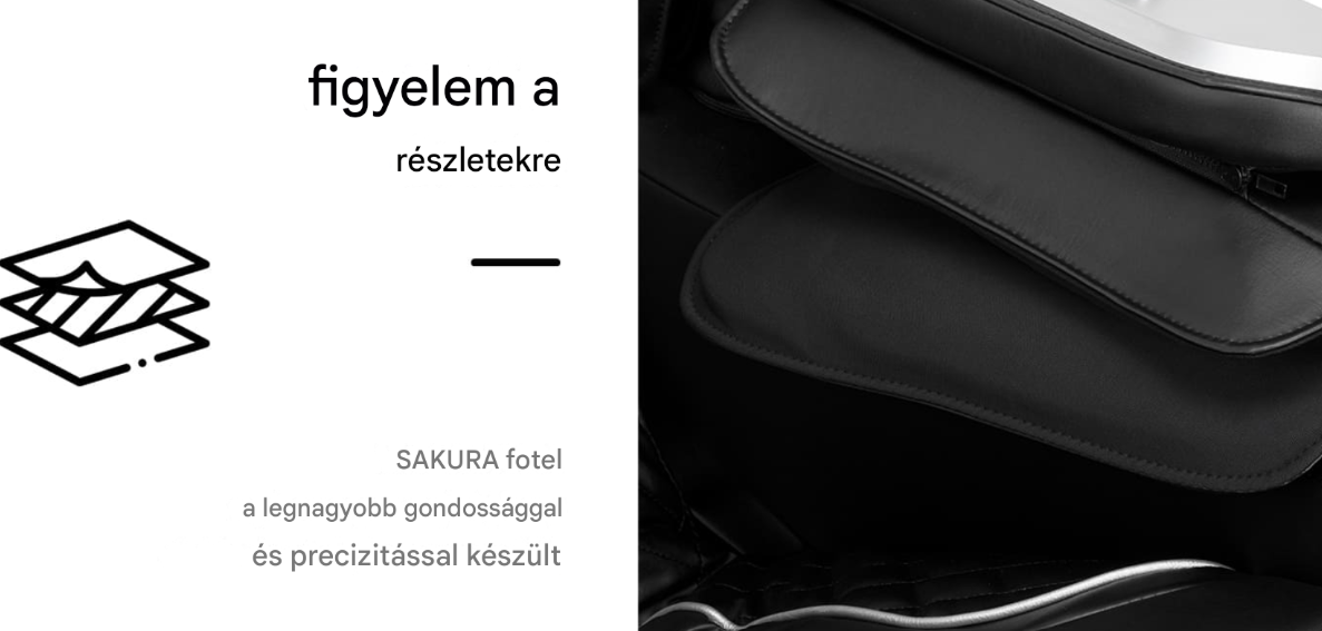 A Sakura masszázsfotelek ellazulást és magas kényelmet biztosítanak. Emellett kiváló módjai az egészség és a közérzet javításának. Sokoldalú funkcióik és könnyű használatuk kiváló választássá teszik ezeket a székeket mind masszázsterápiához, mind otthoni használatra. A részletekre való aprólékos odafigyeléssel készültek, így esztétikus kiegészítői lesznek bármely térnek.
