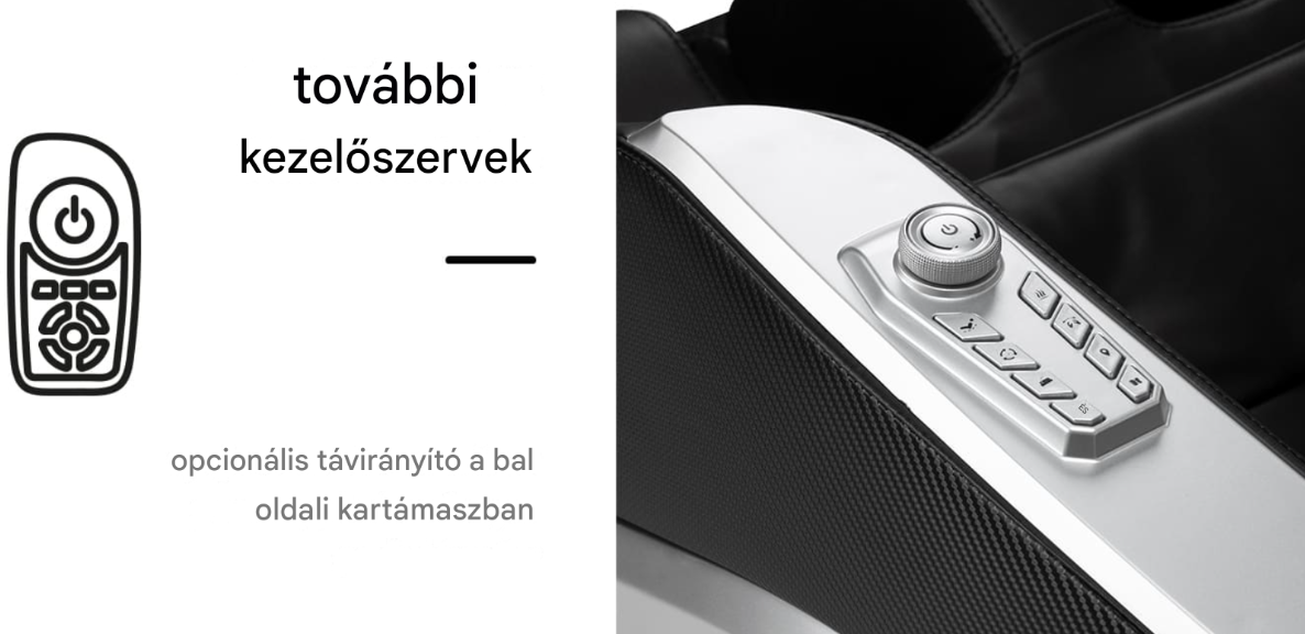 A még nagyobb kényelem érdekében a szék bal oldali kartámaszán egy további vezérlőgomb-készlettel rendelkezik . A beépített, praktikus távirányító gyors hozzáférést biztosít a kulcsfontosságú funkciókhoz anélkül, hogy a fő panelhez kellene nyúlni . A felhasználók könnyen válthatnak a masszázs típusa között, elindíthatják a lábmasszázst és aktiválhatják a nulla gravitáció funkciót – mindezt a maximális kényelem és relaxáció szem előtt tartásával.